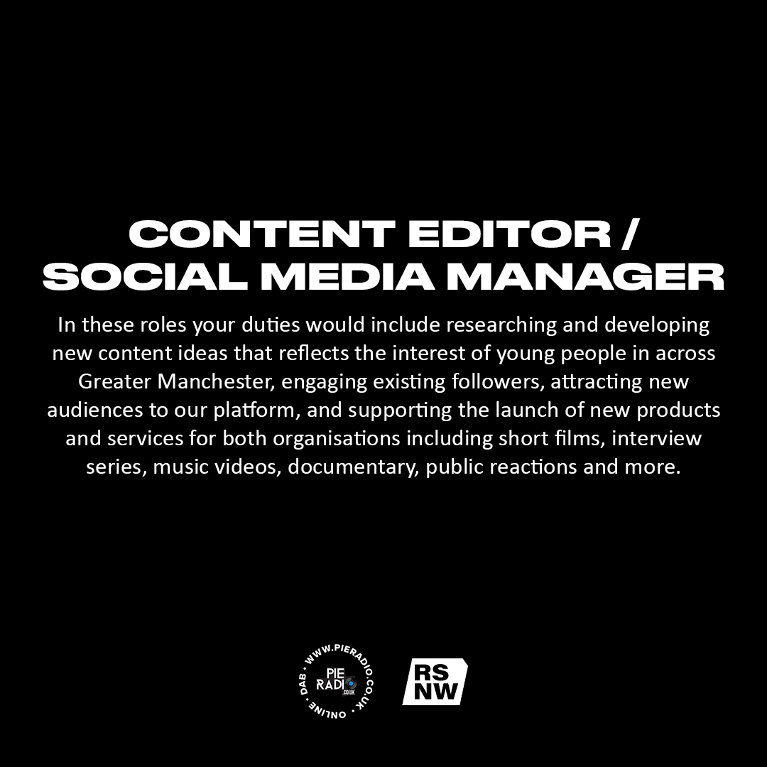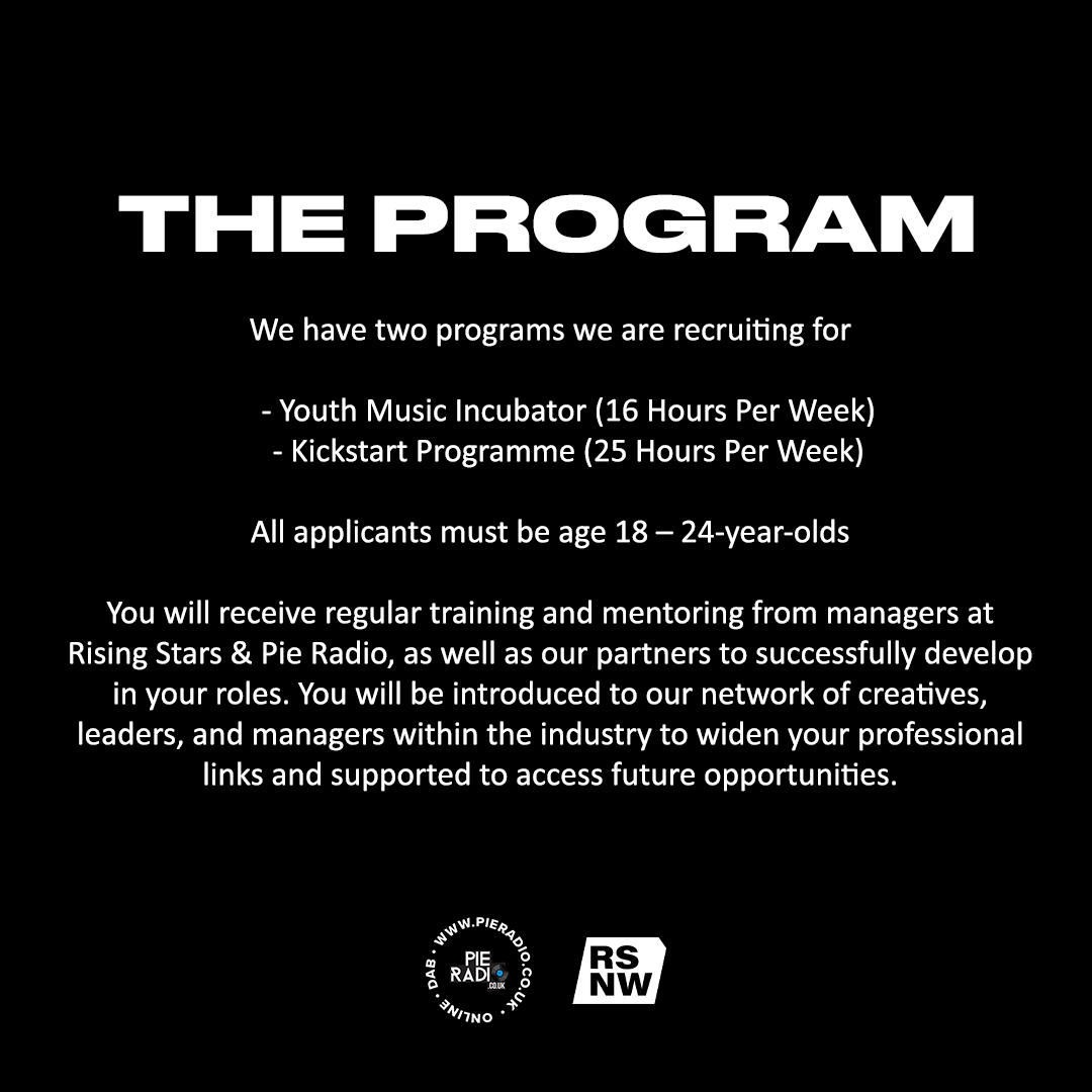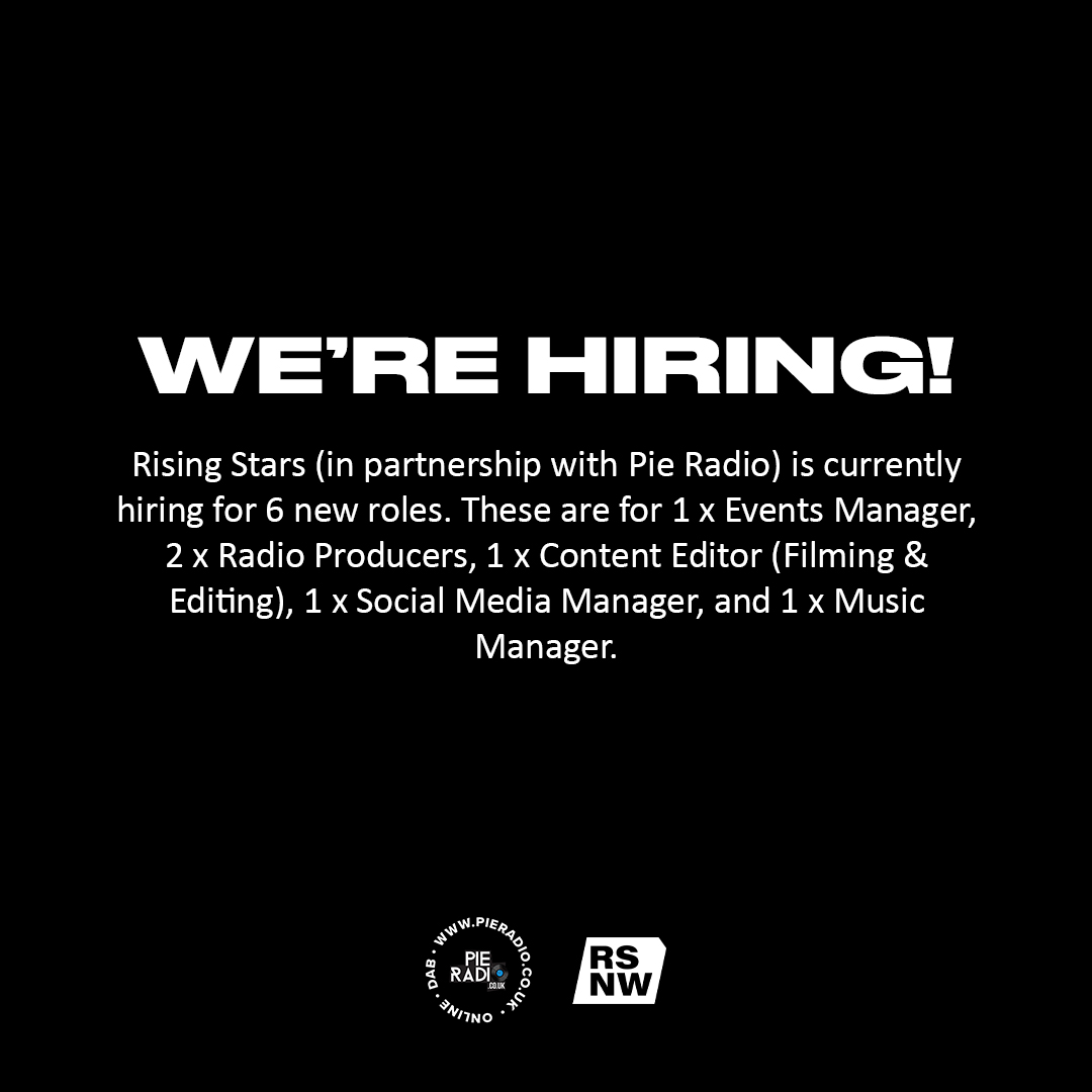 Rising Stars in partnership with Pie Radio are currently hiring for 6 new roles. These are for 1 x Event Manager, 2 x Radio Producers, 1 x Content Editor (Filming & Editing), 1 x Social Media Manager, and 1 x Music Manager.